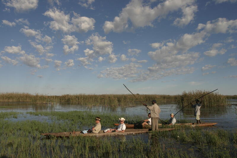Am Vormittag fahren Sie nach Maun, um Getränke einzukaufen, und reisen weiter zum Rand des Okavangodeltas. In traditionellen Einbäumen gleiten Sie gemächlich durch schilfgesäumte Kanäle und Überschwemmungsgebiete des Deltas. Geführte Wanderungen und zwei Nächte Wildcampen auf einer Insel machen die Safari unvergesslich. Ein Helikopterflug bietet schließlich spektakuläre Ausblicke aus der Vogelperspektive auf Elefanten, Giraffen und Flusspferde.