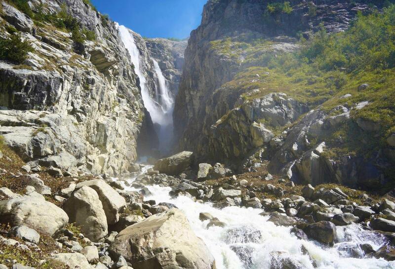 Nach einer kurzen Fahrt in den Nachbarort Schichra beginnt Ihre Wanderung entlang des Flusses Dolra. Anfangs führt der Weg über einfache Pfade durch Tannenwälder hindurch, später wird der Anstieg steiler. Die Uschba-Wasserfälle liegen eindrucksvoll über einer Felskante. Dahinter zeigt sich der Uschba mit seinem Doppelgipfel. In dieser eindrucksvollen Kulisse legen Sie eine Picknickpause ein, nur vom Rauschen der Wasserfälle umgeben. Danach folgen Sie dem Weg hinab und fahren zurück nach Betscho.