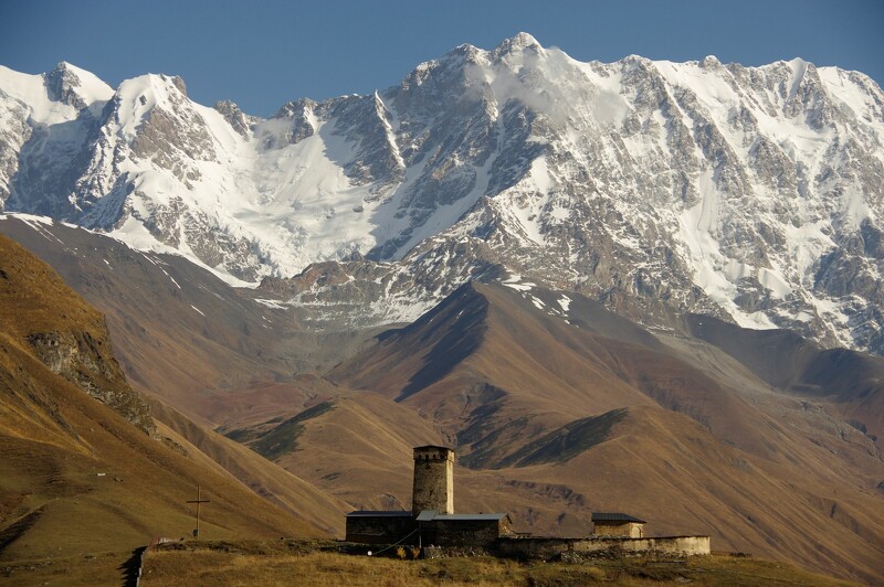 Eingebettet zwischen den höchsten Gipfeln des Kaukasus leben die Swanen, die dank der abgelegenen Lage viele Traditionen bis heute bewahren konnten. Die typischen Wehrtürme prägen jedes Dorfbild und erzählen von einer Zeit, in der jede Familie ihr eigenes Fort besaß. Wenn Sie durch Ushguli gehen, scheint die Zeit langsamer zu werden. Zwischen den jahrhundertealten Steinhäusern sehen Sie Dorfbewohner, die ihre Kühe entlang der Wege melken – ein Alltag, der hier noch ganz selbstverständlich ist. Dahinter erhebt sich die gewaltige Nordwand der Schchara. Ihre 5.201 Meter hohe Eismauer überragt das Dorf und macht spürbar, wie eng Natur und Lebenswelt hier bis heute miteinander verwoben sind.