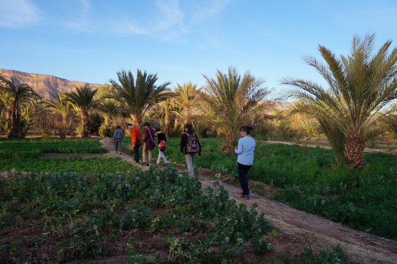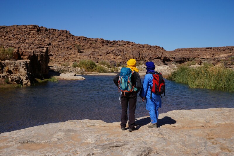 Heute wandern Sie über die Ebene bis zur Oase Diadat. Von dort steigen Sie entlang des Flussbettes Mhasseur langsam ab. Dabei sind sie umgeben von einer abwechslungsreichen Landschaft mit kleinen Gueltas – natürlichen Wasserstellen, die sich meist in felsigem Gelände verberen und von rosarotem Oleander gesäumt sind. Kleine Oasen sitzen wie Farbtupfer in der kargen Fels- und Steinlandschaft. Ihr heutiges Zeltcamp schlagen Sie am Flussbett Mhasseur auf.