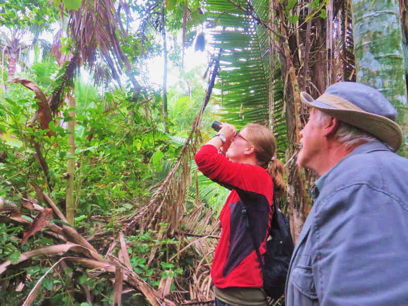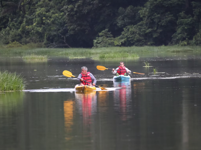 Früh am Morgen besteigen Sie einen 32 Meter hohen Aussichtsturm. Von oben bietet sich ein fantastischer Panoramablick über das weitläufige Baumdach des Regenwaldes und über den See. Bei Kaffee oder Tee beobachten Sie in aller Ruhe verschiedene Tiere, darunter zahlreiche Vogelarten. Nach dem Frühstück machen Sie einen geführten Spaziergang in den Dschungel und entdecken weitere Tier- und Pflanzenarten. Eine entspannte Katamaranfahrt auf dem See am Nachmittag rundet den Tag ab.