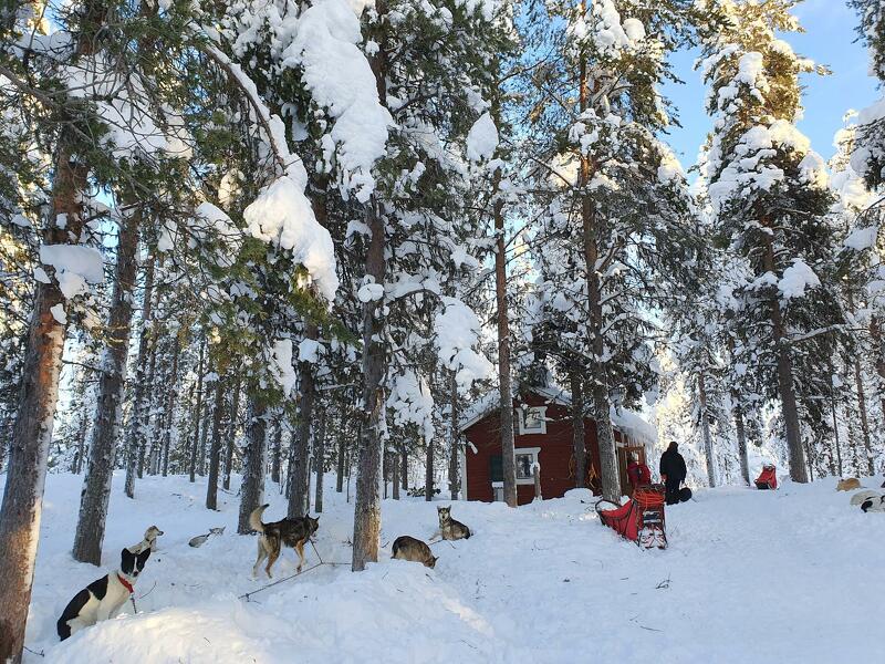 Heute ist es Zeit weiterzuziehen. Nach dem Frühstück packen Sie Ihre Schlitten, spannen die Hunde ein und setzen Ihre Reise durch die nordschwedische Wildnis fort. Über zugefrorene Seen und durch schneebedeckte Wälder fahren Sie zur zweiten Wildnishütte. Auch hier gibt es kein fließend Wasser oder Strom, dafür die wildromantische Kulisse einer rustikalen Holzhütte, eingebettet ins endlose Weiß um den Onkijärvi See.